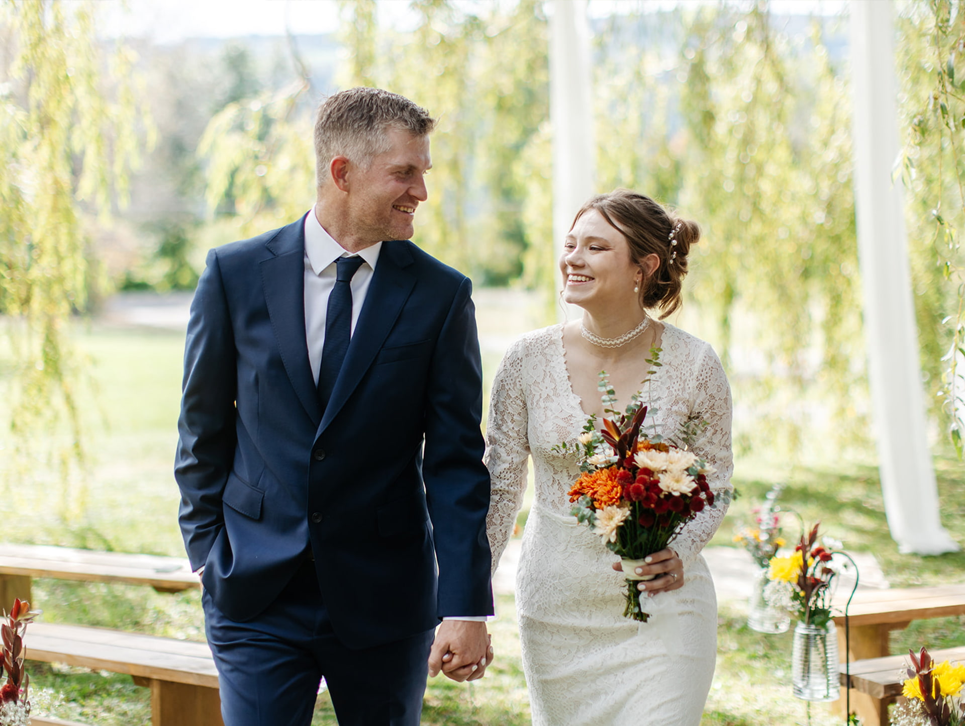 You can take it easy on the decor too, especially if your location is naturally beautiful. Emily and Luke had benches set out for their family and friends and a station where they could pick up dried flower petals to throw. I think name cards and a cozy blanket for keeping warm would be beautiful too and is an idea I LOVE for fall weddings.